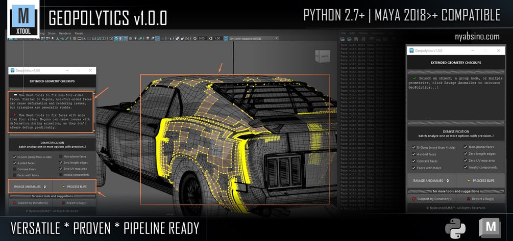 Geopolytics™ is the main application that extends the limited features of the Shapeschecker™ tool for Autodesk® Maya®. It delivers even more advanced methods for polygonal geometry defects identification and resolute with precision for an extended range of anomalies [Zero Length Edges, Zero UV Map Area, Invalid Components, 4-Sided Faces, N-Gons (More Than Four Sided), Faces with Holes, Concave Faces, and Non-planar Faces]. One of its profound features is the components batch analysis capability with consecutive objects processing—which enables users to analyze multiple objects selection or grouped objects, significantly boosting productivity. This feature makes it a vital resource in environment modeling, architectural visualization, creature modeling, hard surface modeling, and industrial design—with unmatched diagnostics.
